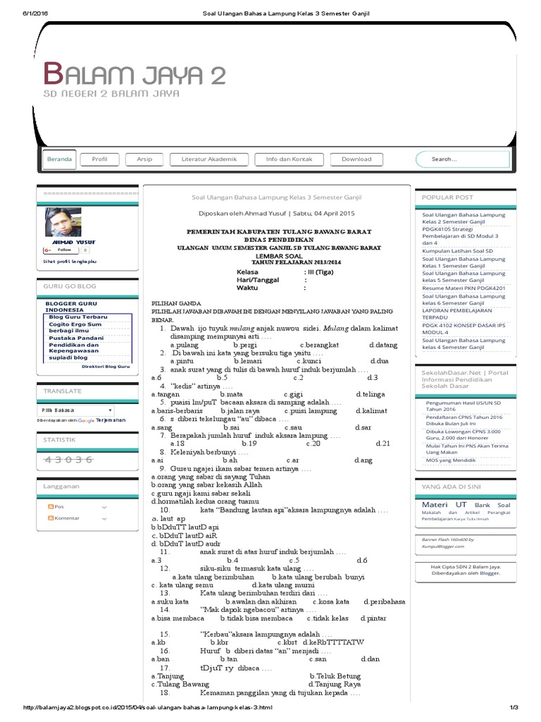 Soal Latihan Uts Bahasa Lampung Kelas 6 Mashenry Com from 1.bp.blogspot.com We did not find results for: Check spelling or type a new query. Maybe you would like to learn more about one of these? Soal ulangan bahasa lampung kelas 4 semester 2.